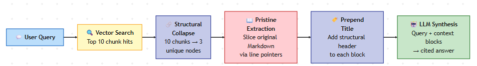 Это означает, что даже если фрагмент совпадает только с одним предложением глубоко внутри раздела, LLM синтеза получает весь раздел — с его заголовком, его контекстом, его рисунками, его выводами. Фрагмент был одноразовым; указатель — это то, что имеет значение.