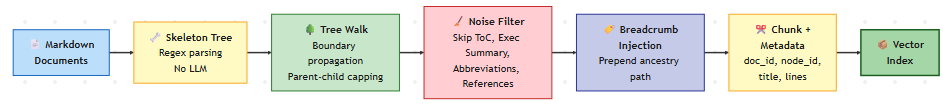 Система использует то же структурное дерево, используя PageIndex — но без дорогостоящего флага суммирования. Построение этого скелетного дерева не требует дорогостоящих вызовов LLM во время индексирования. Дерево строится исключительно на основе обнаружения заголовков на основе регулярных выражений, что занимает миллисекунды.